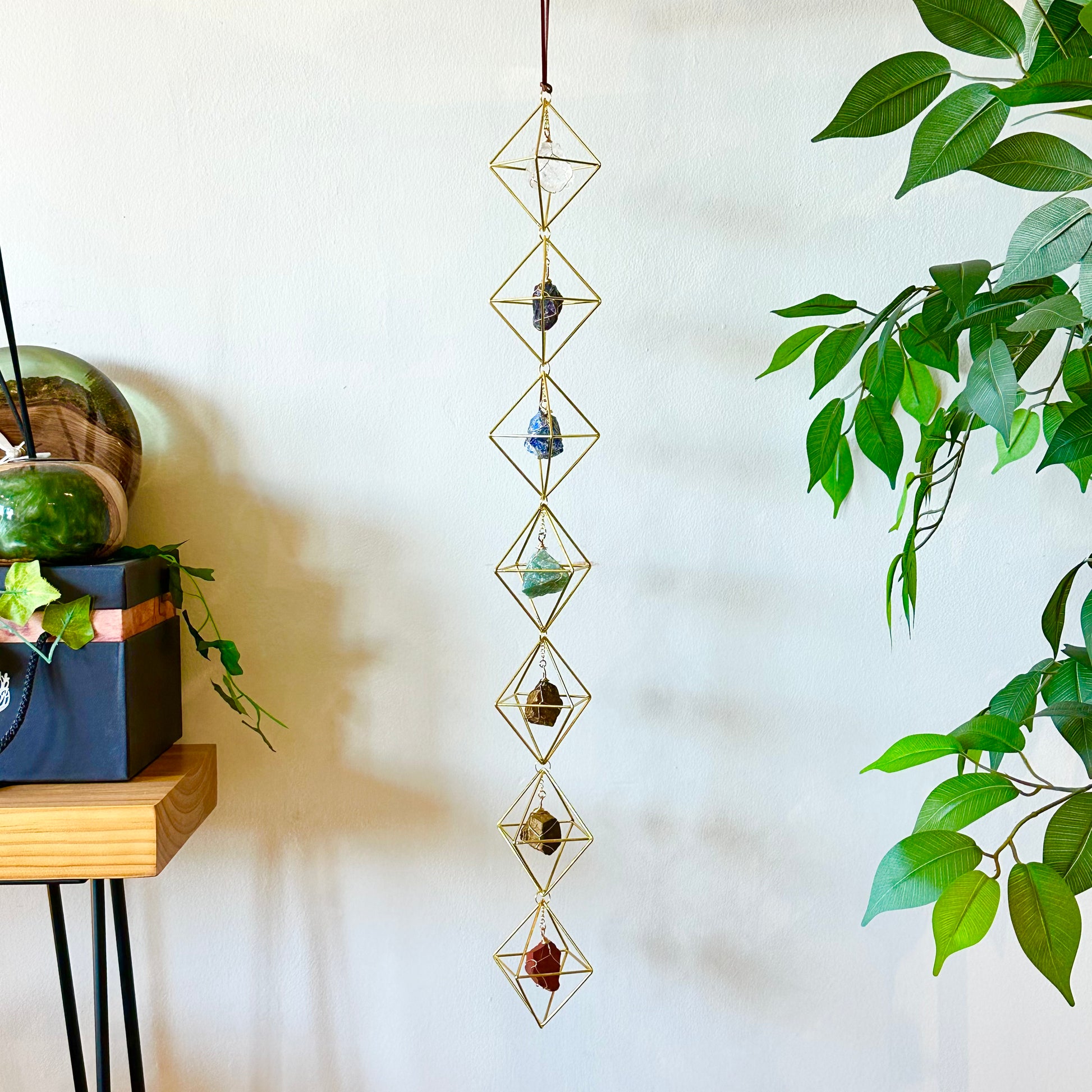 ★ GOLD FRAME - Chakra hanging consists of 7 large gold circles, 3" diameter each or gold rhombus shape. Each circles have different raw crystal attached to it.